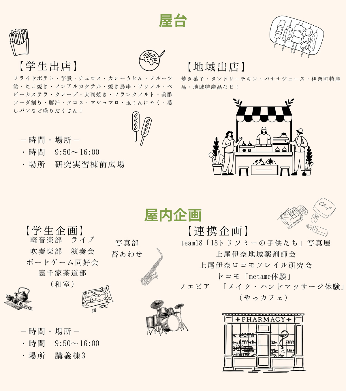 本学園祭では、ステージ発表、模擬店、展示企画など、あらゆる催しを通じて、参加者の皆様が自然と笑顔になれるような空間づくりを目指しております。