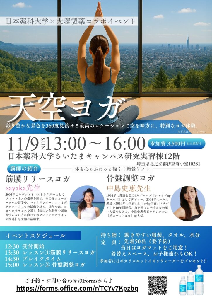 日本薬科大学と大塚製薬株式会社のコラボイベント「天空ヨガ」をさいたまキャンパス研究実習棟12階で開催します。