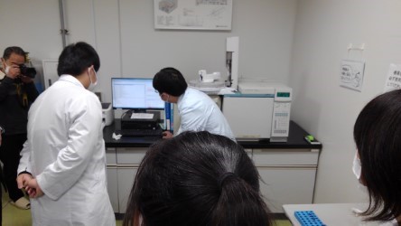 秩父農工科学高校では、埼玉県の「農力」育成強化プロジェクトの研究指定を受けていて、「第3のみつ」の製造と機能性成分の研究に継続的に取り組んでいます。また、地域特産物の開発に力を入れています。すでに「第3のみつ」では特許も取得しています。そのため、高校では珍しく最新のガスクロマトグラフGC、イオンクロマトグラフIC、高速液体クロマトグラフーLCが導入されています。生徒たちの中には、食品化学に関連する大学に進学が決定している生徒もいて、研修に熱心に取り組んでいました。