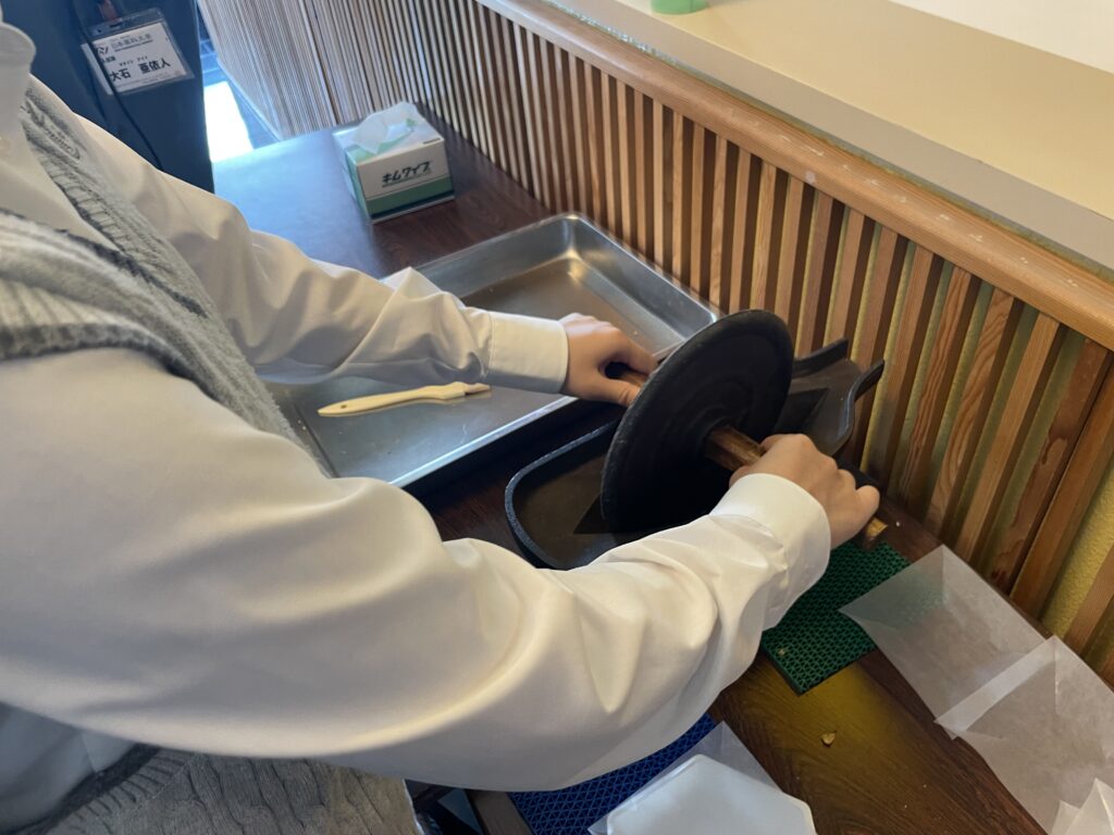 また研究棟内にある模擬薬局を体験の後、薬研体験して生薬を磨り潰してオリジナルのハーブティを作り、試飲しました。