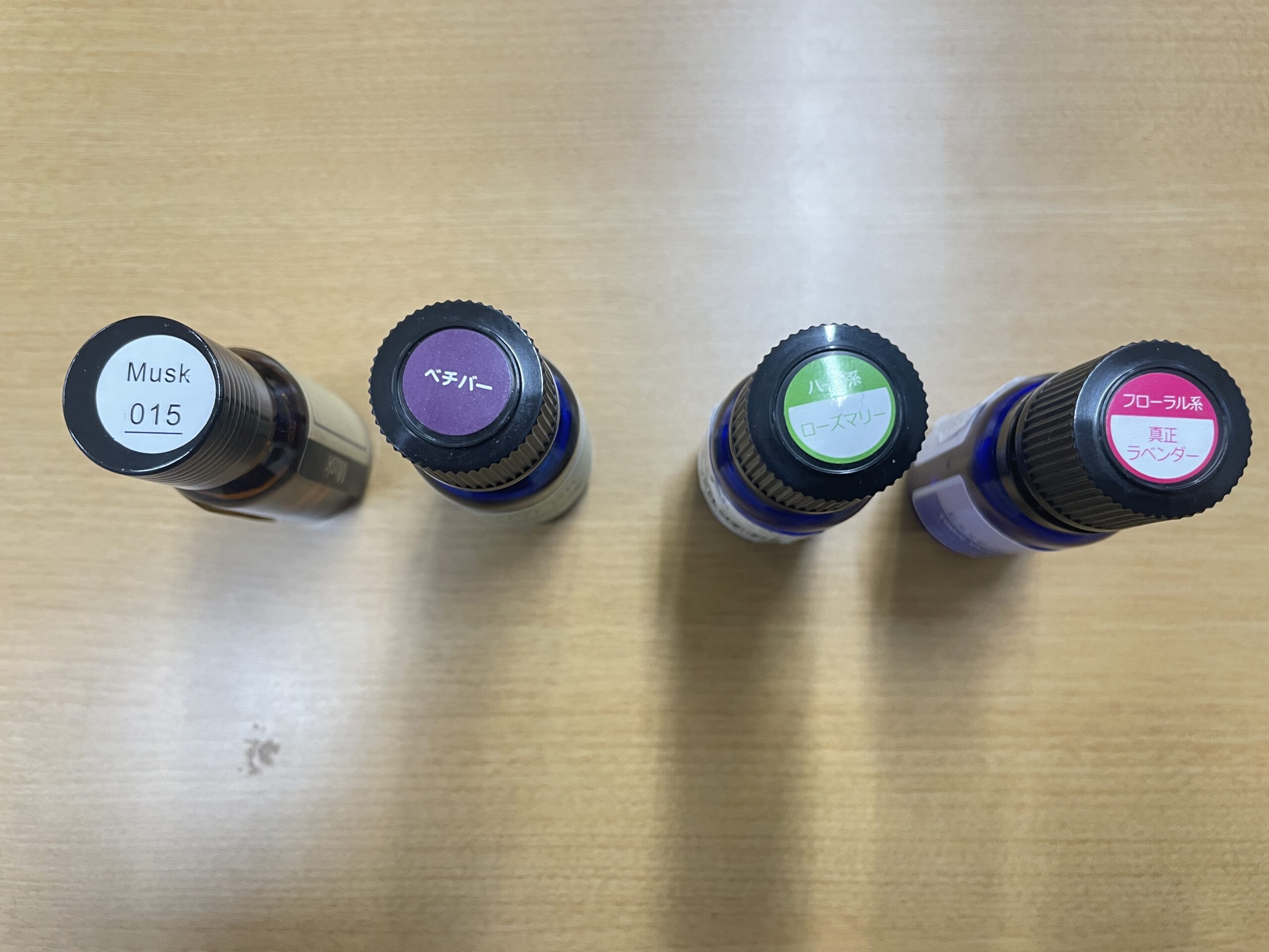 交感神経を優位にすると言われている①ローズマリー、副交感神経を優位にすると言われている➁ラベンダー、リラクゼーション効果があるとされている③ベチバー、④ビューティウェルネスゼミの生徒が作成した香水、薬学ゼミ生が持ち込んだアンブレットシード(ムスク似香)を使用して香の好みと薬理効果を検証しました。