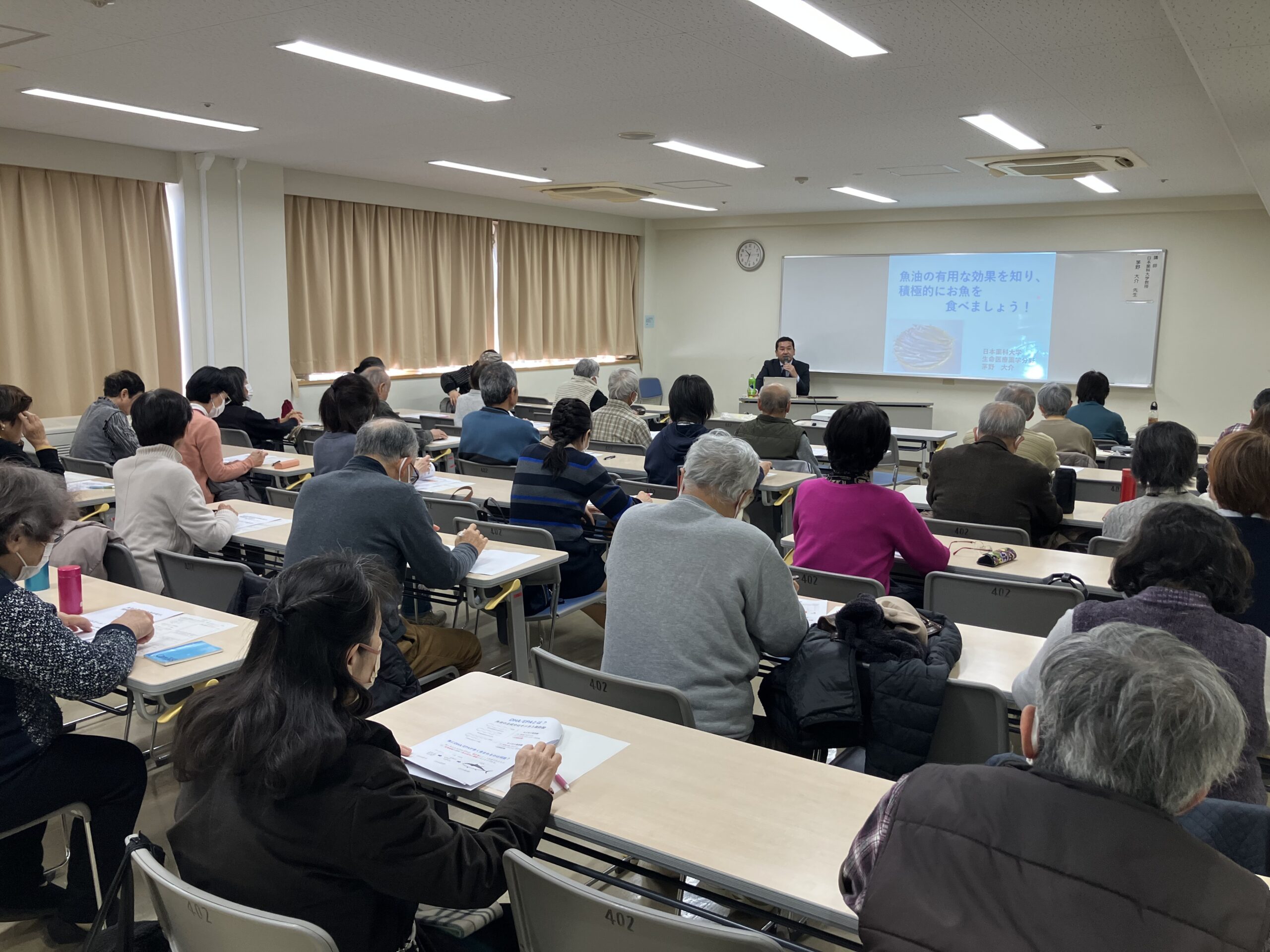 12月9日(火)、上尾公民館との共催の市民講座にて、本学の茅野大介教授が講師を務め、上尾市民37名が受講されました。 「魚油の有用な効果を知り、積極的にお魚を食べよう!」をテーマに、魚に多く含まれる DHAやEPAについて学びました。