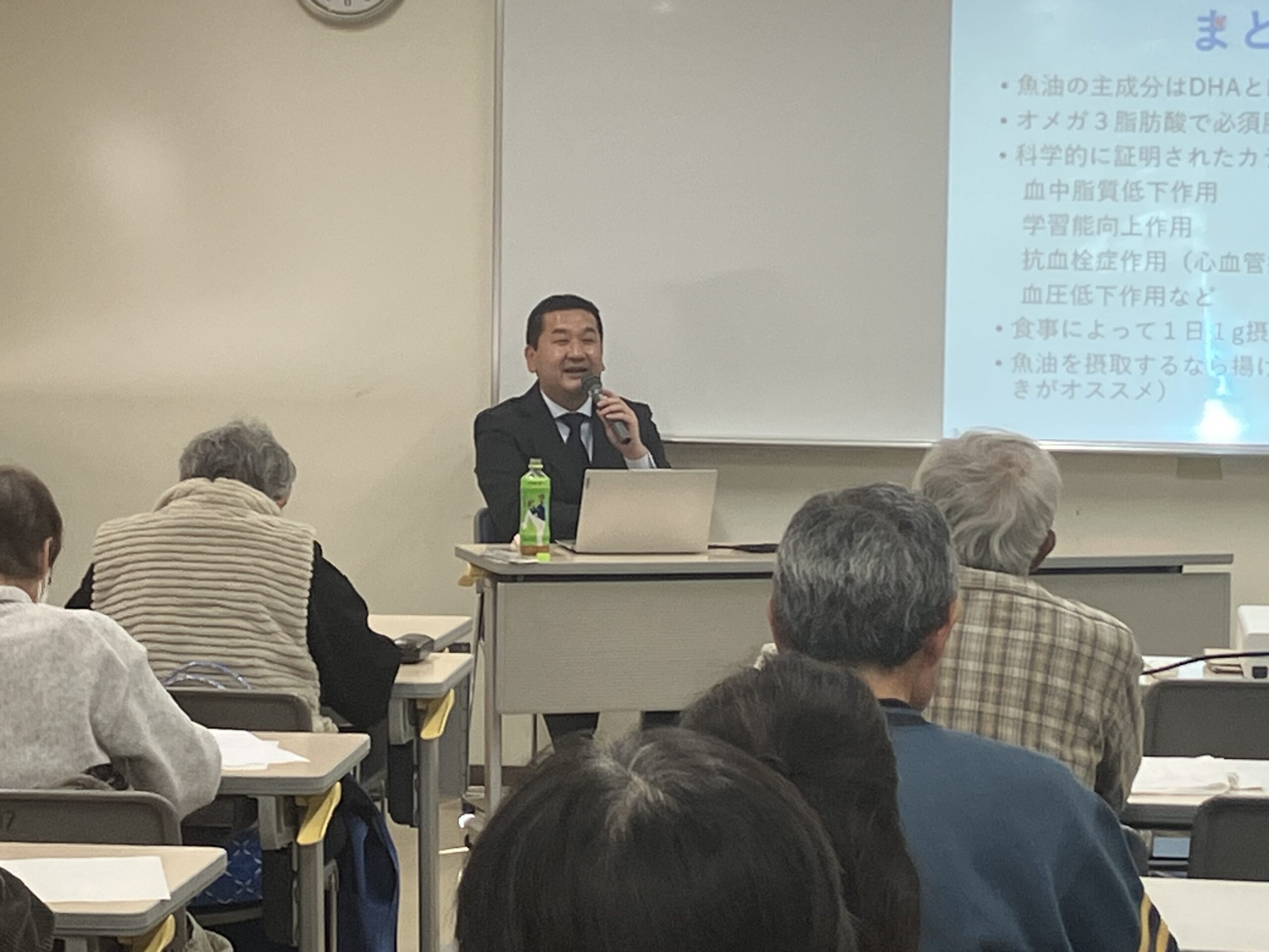 日常的によく食べる魚が持つ特性について理解を深められる内容の講座でした。講座終了後には、魚油を効率的に摂取できる調理法などについて多くの質問が寄せられ、参加者の関心の高さがうかがえました。
