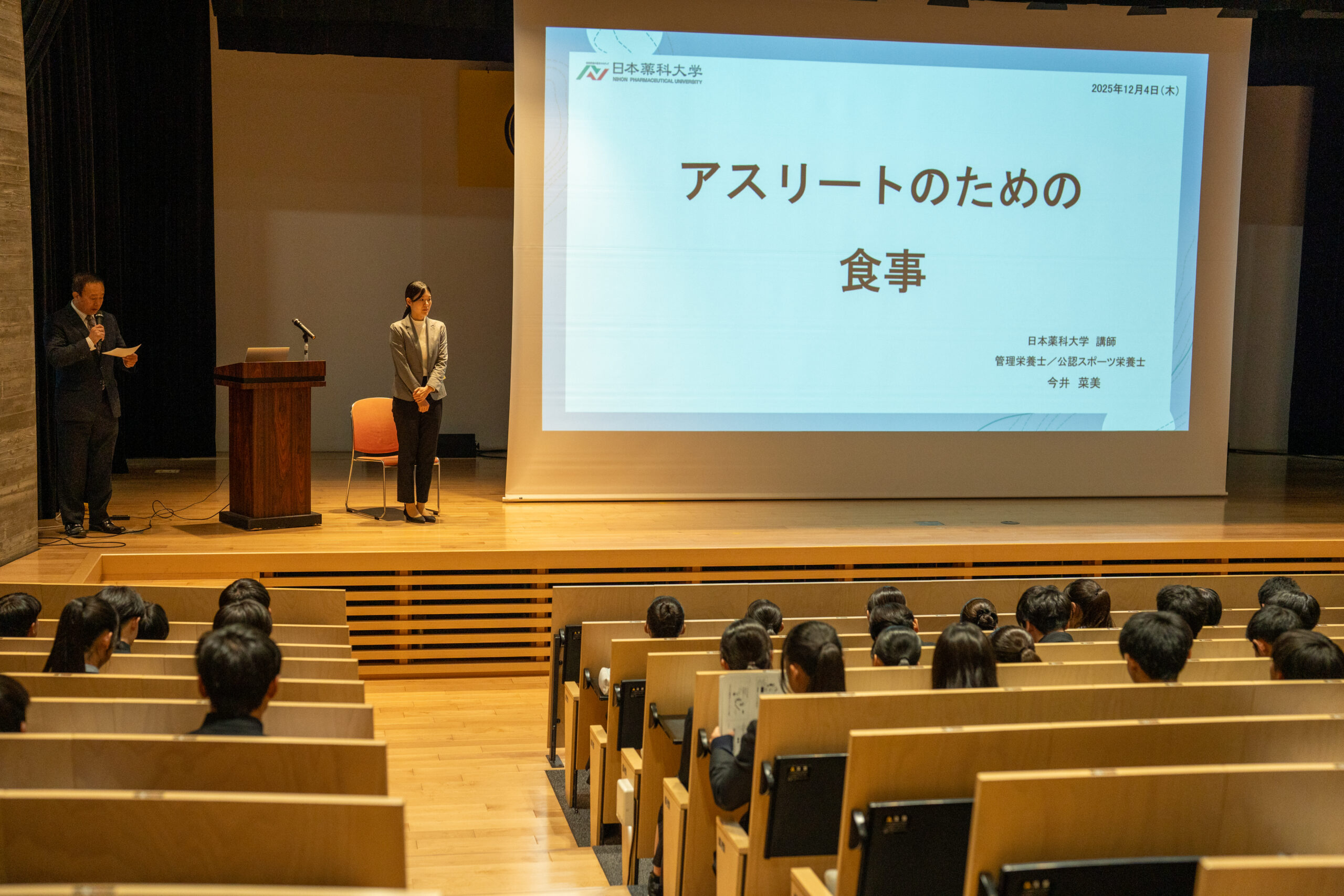 12月4日(木)に連携校である川口市立高等学校において、本学 管理栄養士・公認スポーツ栄養士の今井講師が、同校スポーツ科学科の1年生、2年生を対象に「アスリートのための食事」をテーマとした講演を実施しました。