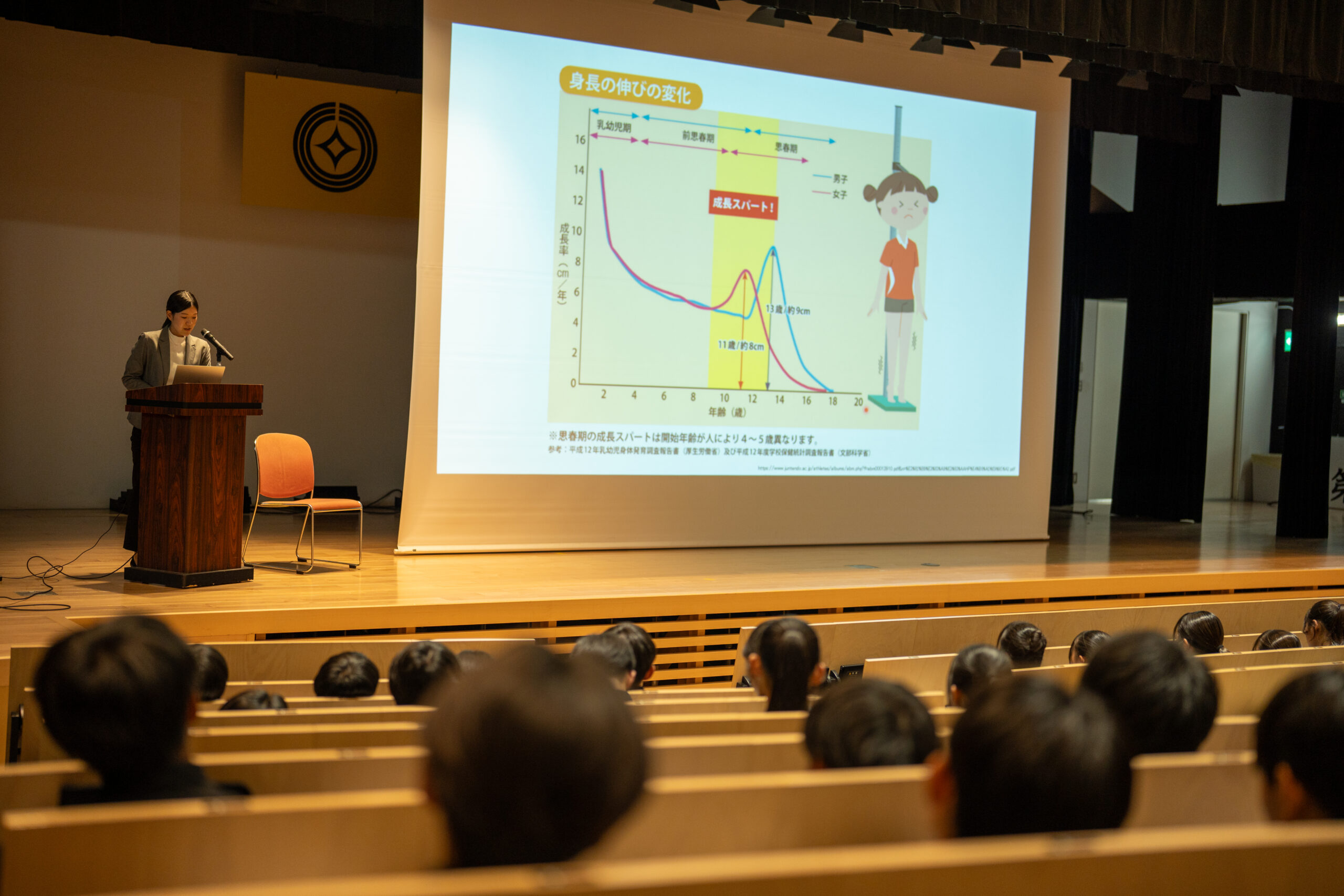 さらに、試合前後や練習時における食事・補食の適切なタイミング、骨や筋肉の発達を支える栄養素の摂取方法など、競技現場で実践できる内容が紹介され、生徒たちは自身の競技生活と結び付けながら理解を深めていました。