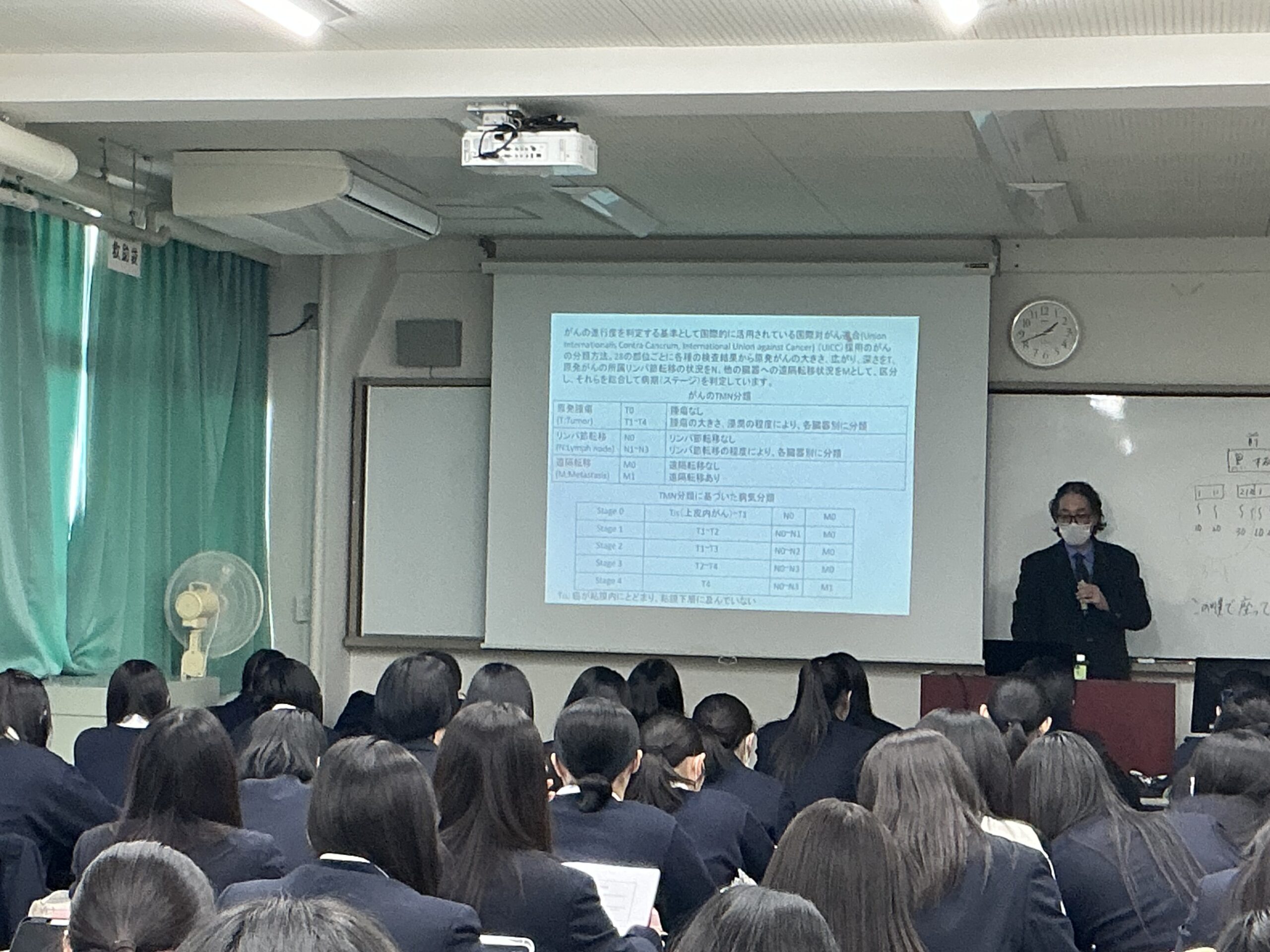 本講義は看護科3年生全員に行われ、将来の看護師にとって必要となる抗がん剤の講義を熱心に聞いていました。