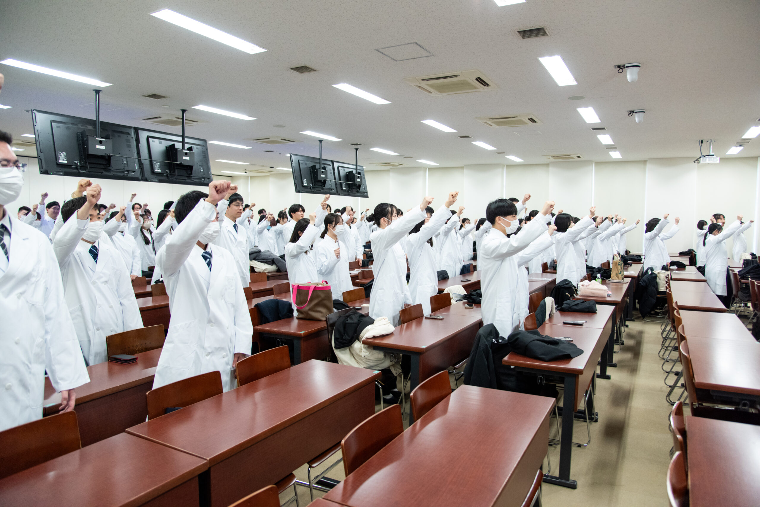 同科4年生は、薬学部長、実務実習委員長、5年生代表者等から激励メッセージを受け、これから始まる実習に対する決意を表明し、真新しい白衣に袖を通しました。