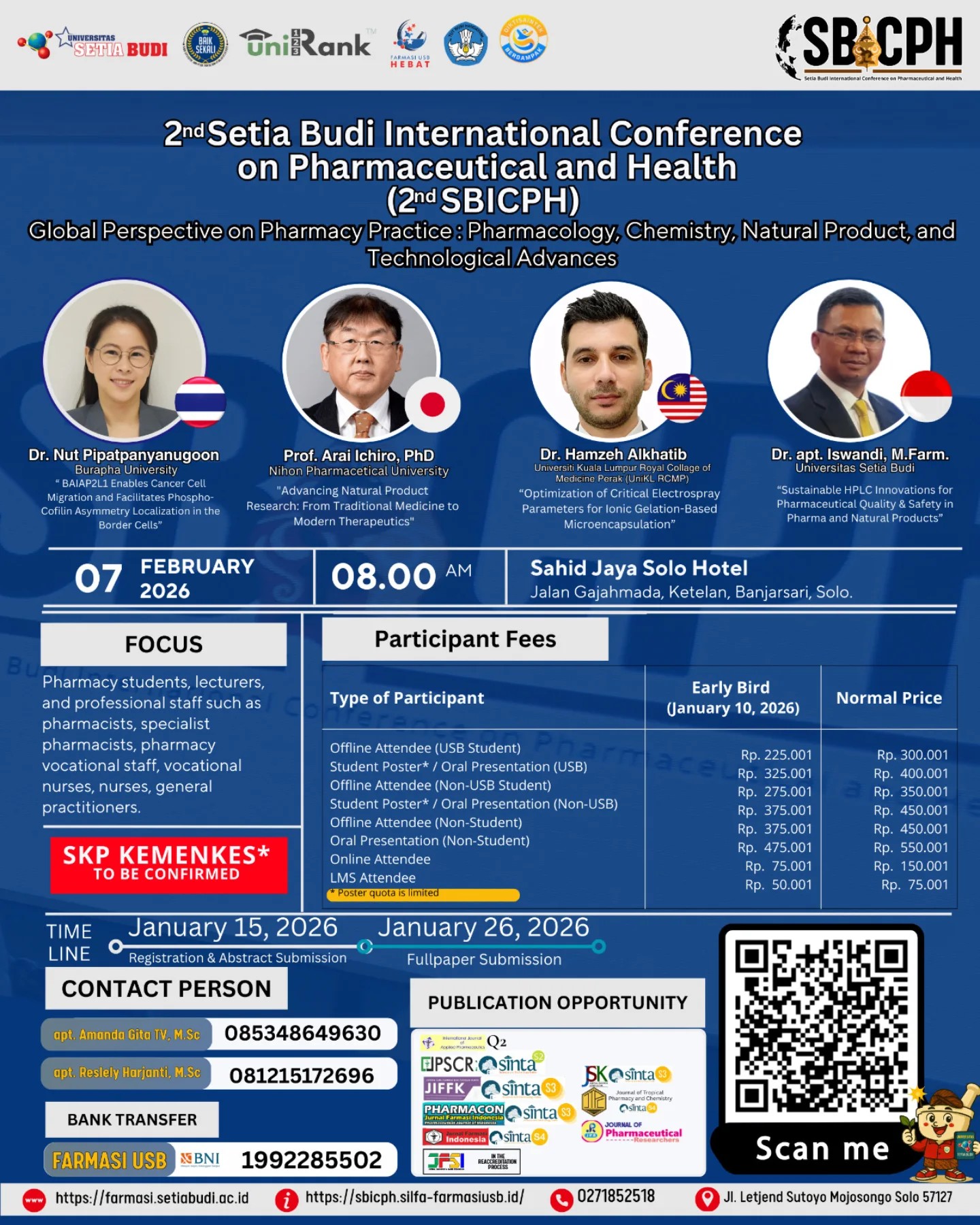 新井副学長が、2月7日、インドネシアのセティア・ブディ大学が開催した第2回セティア・ブディ・薬と健康・国際会議において招待講演(オンライン)を行いました。セティア・ブディ大学は、本学が学術交流提携をしたインドネシア薬学高等教育協会(AIPHE)のメンバー大学です。今後も、研究・教育・学生交流で連携を深めていく予定です。