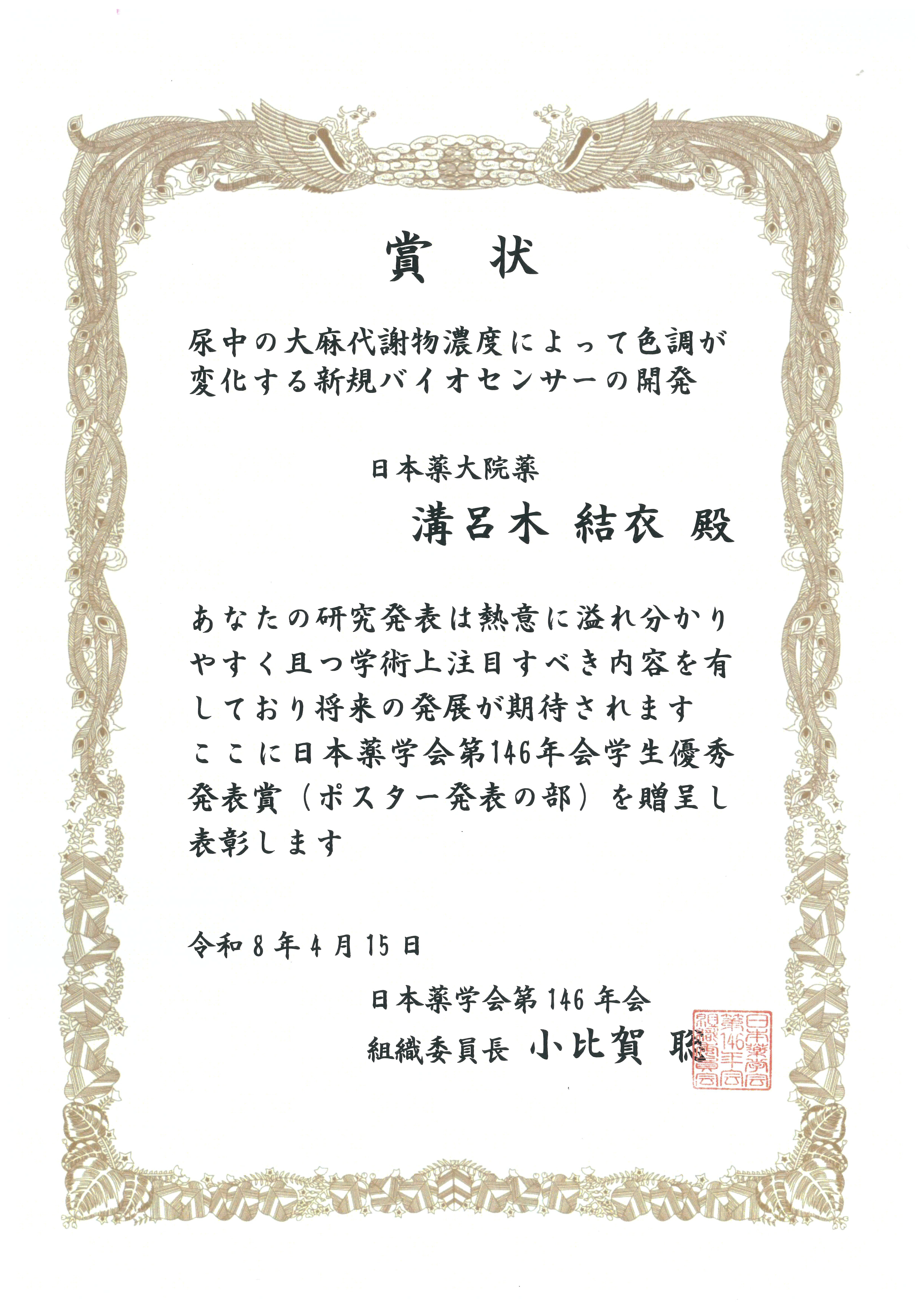 本学の大学院生が日本薬学会第146年会において学生優秀発表賞を受賞しました